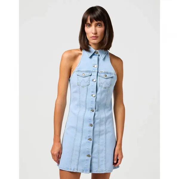 칼라 넥라인과 버튼다운 프론트 클로저는 클래식한 터치를 제공하고, 트윈 체스트 플랩 포켓은 이 매력적인 미니 드레스에 기능적인 요소를 더합니다.