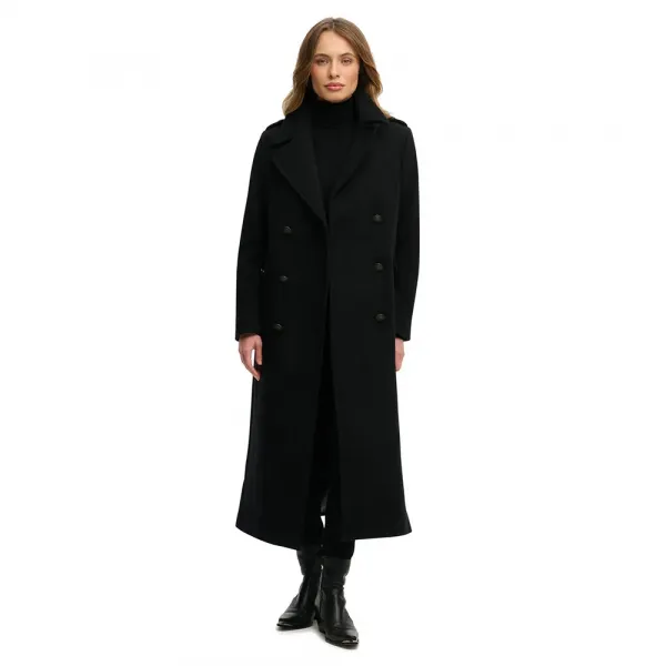 구조적인 더블 브레스티드 디자인은 허리 라인을 우아하게 잡아주어 돋보이고 강력한 실루엣을 연출합니다.