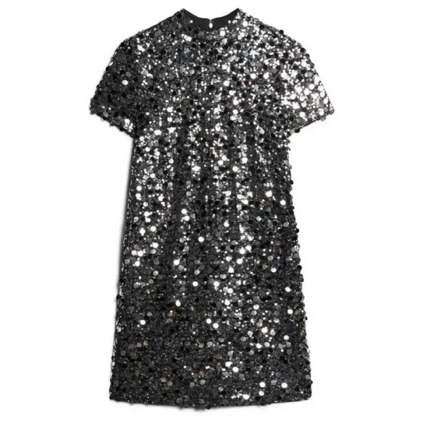 심플한 디자인의 티셔츠 드레스를 재해석하여 수백 개의 스팽글 자수로 디테일에 대한 놀라운 집념을 담아냈습니다.