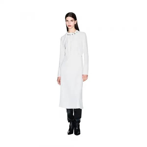 긴 소매 핏앤플레어 원피스, 메탈릭 디테일 볼칸 넥.