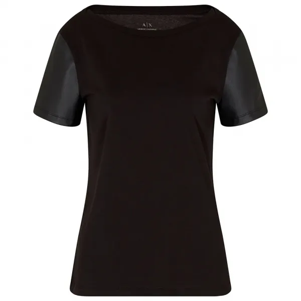 짧은 에코 가죽 소매의 크루넥 티셔츠.