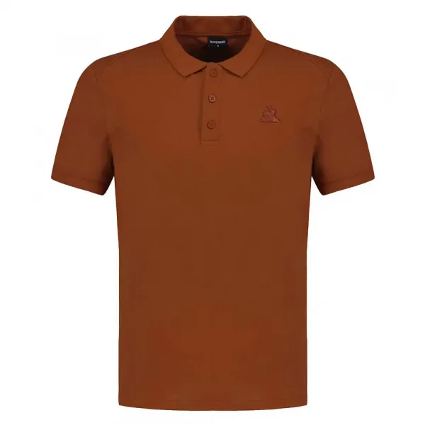 기술적 특징:- 갈색 반팔 폴로 셔츠.