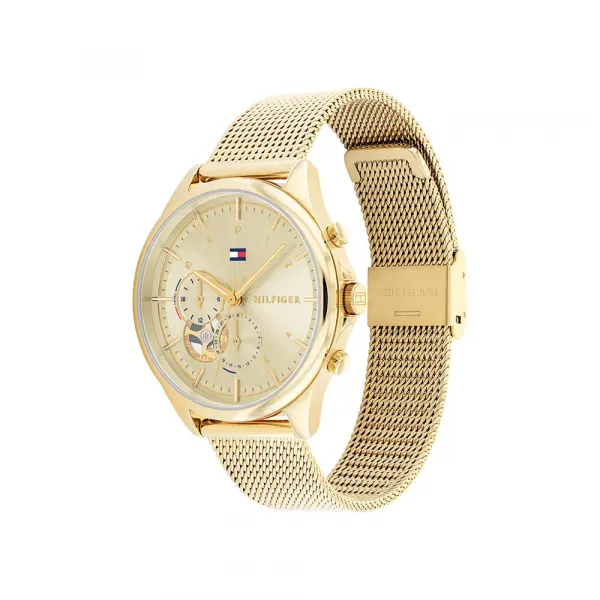 기술 사양: 모델: TOMMY HILFIGER Quinn 성별: 여성 무브먼트: 쿼츠 멀티펑션 디스플레이: 아날로그 다이얼 색상: 골드 기능: 요일, 날짜, 24시간 시간 표시 케이스 직경: 38 mm 케이스 마감: 폴리싱된 골드 톤 브레이슬릿: 메시 브레이슬릿 브레이슬릿 색상: 골드 톤 방수: 3 ATM (30 미터) - 생활 방수, 수영 또는 목욕에는 적합하지 않음.