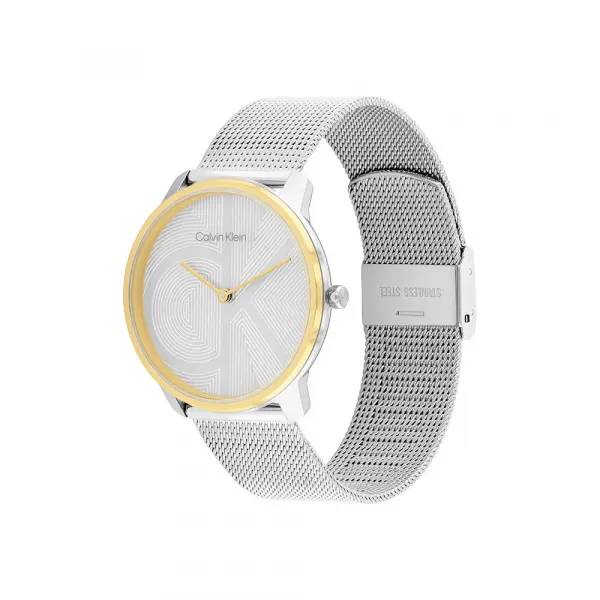 35mm 스테인리스 스틸 케이스, 옐로우 골드 이온 도금, 아이코닉한 CK 로고가 있는 블랙 다이얼, 옐로우 골드 이온 도금 밀라네즈 메시 브레이슬릿.