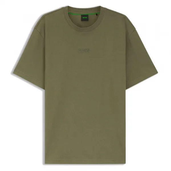 5cm BOSS 로고 핏: 레귤러 핏 책임감 있는 헤비 저지 품질의 원단으로 제작된 이 티셔츠는 대담한 표현을 위해 중앙 전면에 5.