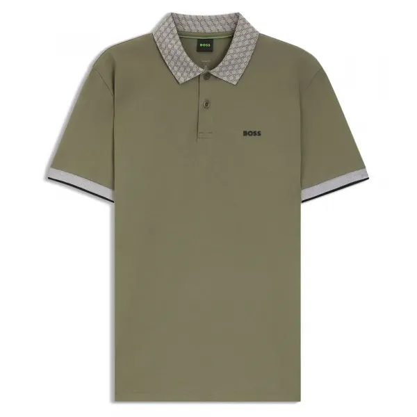 육각형 프린트 칼라가 특징인 이 레귤러 핏 BOSS 남성용 폴로 셔츠는 스포티한 필수 아이템입니다.