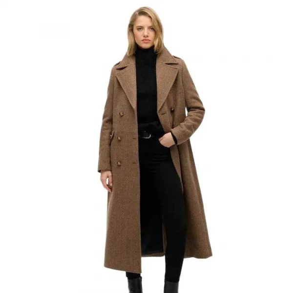 저희 더블 브레스티드 울 혼방 코트는 어떤 의상에도 활력을 불어넣을 강렬하고 세련된 실루엣을 연출합니다.