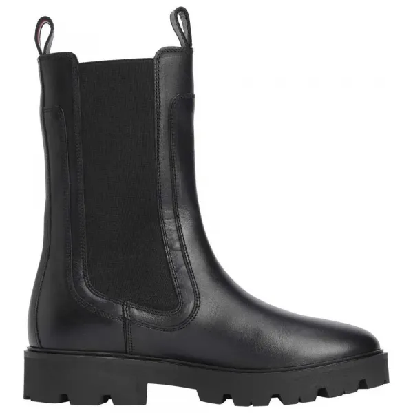 100% 가죽으로 제작된 블랙 여성용 첼시 부츠, 신축성 측면 패널, 풀온 디자인 및 힐 부분의 토미 힐피거 로고 디테일이 특징입니다.