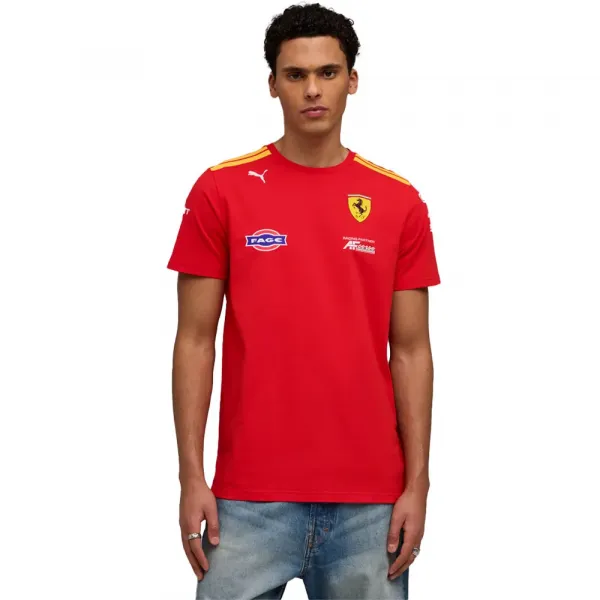 페라리 하이퍼카 팀이 착용한 이 티셔츠는 차량 리버리에 경의를 표하는 디자인을 선보입니다.