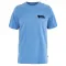 뒷면에 스웨덴 숲 풍경이 프린트된 유기농 면 반팔 티셔츠이며, 앞면에는 작은 로고가 있습니다.