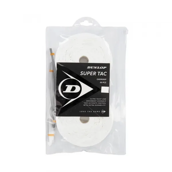 안전한 연결이 만드는 차이를 느끼고 자신감 있게 코트를 지배하십시오 기술 사양: 제품: 던롭 슈퍼택 오버그립 종목: 테니스 카테고리: 라켓 하위 카테고리: 오버그립 패키지 내용물: 마감 테이프 포함 개별 오버그립 30개 표면 유형: 고점착성 두께: 약 0.