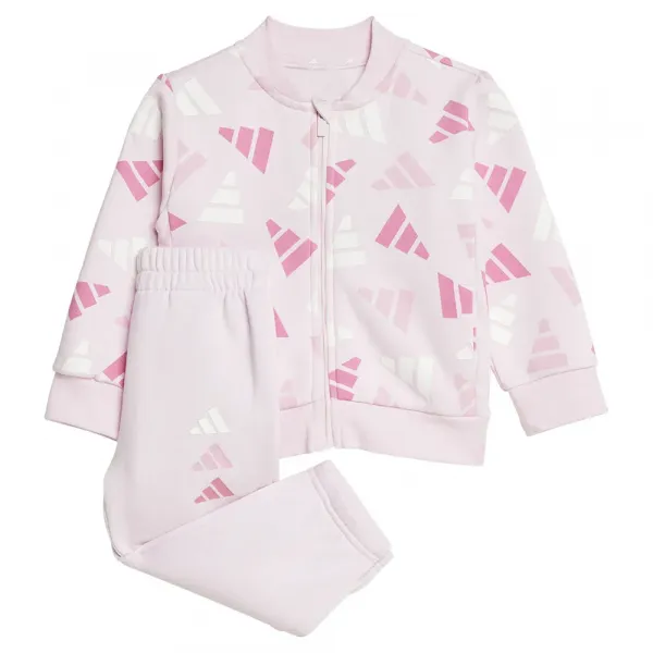 상의는 지퍼로 쉽게 여닫을 수 있어서 아이를 번거롭게 하지 않고 옷을 입힐 수 있으며, 화려한 올오버 로고 프린트가 장난기 넘치는 느낌을 더합니다.