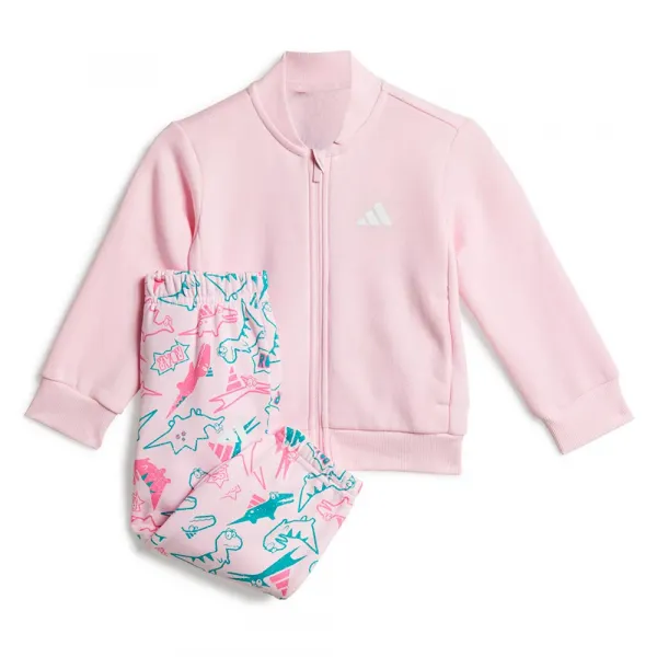 포근한 면 혼방 플리스 소재로 제작되었으며, 뒷면에 공룡 그래픽이 있는 풀 지퍼 재킷과 공룡 프린트 조거 팬츠로 구성되어 있습니다.