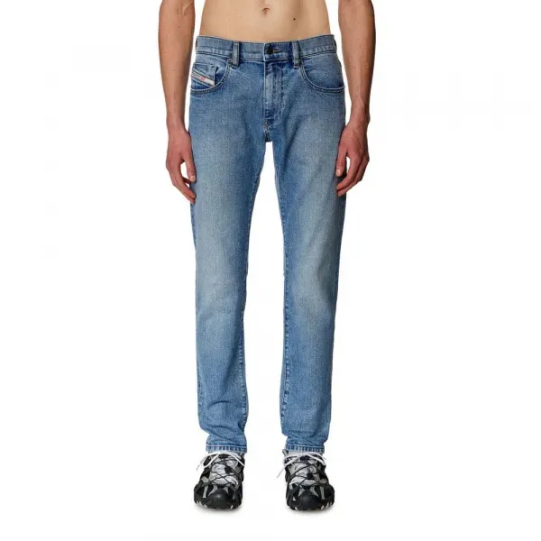 이 다용도 청바지는 지퍼 플라이로 마감된 편안한 실루엣을 특징으로 합니다.