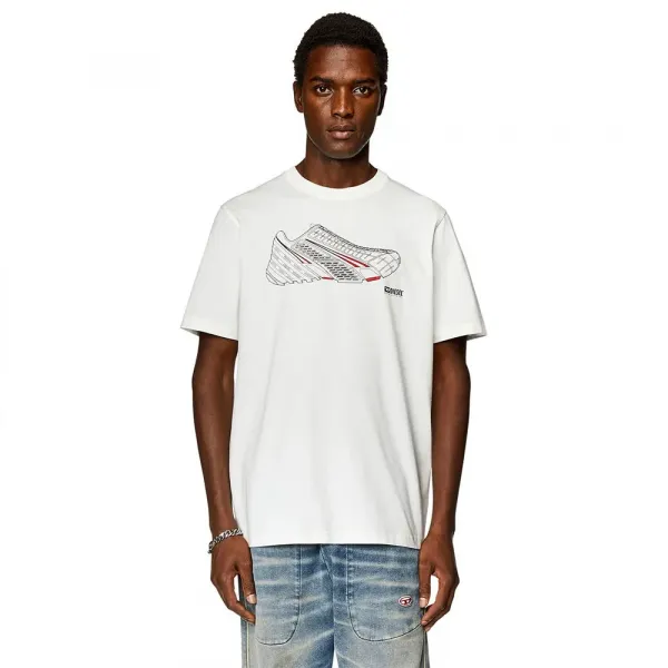 가슴에는 매트와 고밀도 마감이 혼합된 디젤의 아이코닉한 프로토타입 스니커즈가 프린트되어 있습니다.