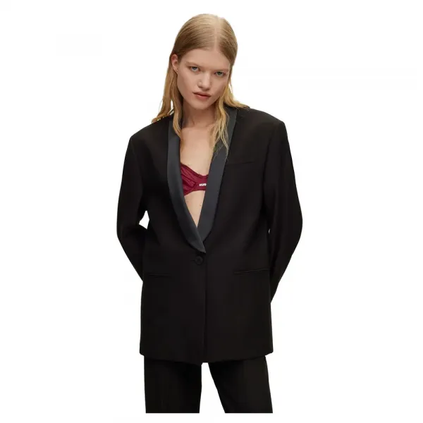 특징:- 오버사이즈 핏- 숄 칼라- 여밈 방식: 버튼 클로징- 웰트 가슴 포켓- 상단 포켓: 웰트 포켓- 버튼 커프스- 벤트 없음- 전체 안감사양:- 소재: 비스코스 79%, 폴리에스터 18%, 엘라스테인 3%- 안감: 비스코스 50%, 폴리에스터 50%- 칼라: 폴리에스터 100%- 소매 안감: 비스코스 64%, 폴리에스터 36%- 버튼 개수: 1관리 방법:- 세탁 금지- 표백 금지- 회전식 건조 금지- 저온 다림질- 드라이 크리닝 (제한적)