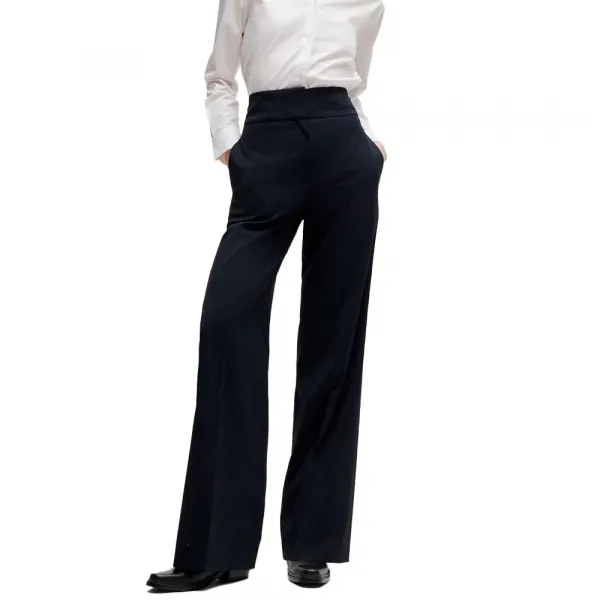 특징:- 레귤러 핏- 하이 라이즈- 후크 및 지퍼 여 closure- 플레어드 레그- 주름- 앞면 하단 포켓: 사이드 포켓- 뒷면 하단 포켓: 웰트 포켓- 안감 없음사양:- 소재: 폴리에스터 84%, 울 15%, 엘라스테인 1%, 포켓: 면 100%- 발 너비: 61.
