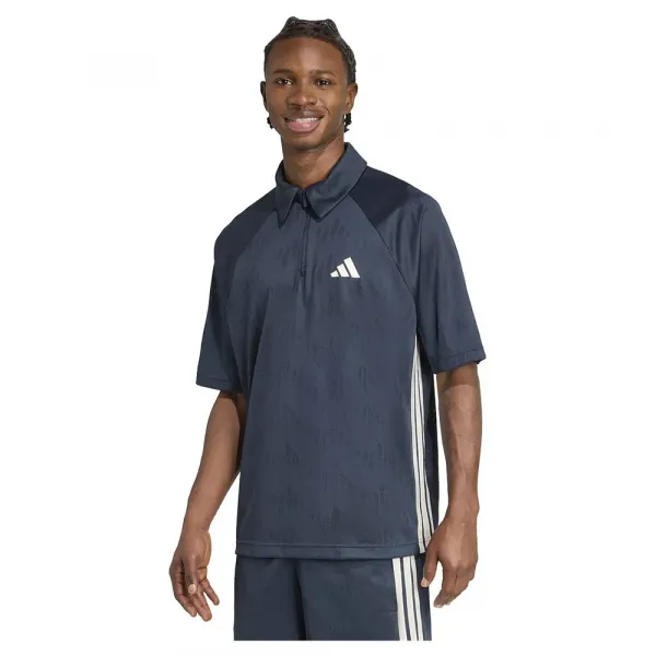 옆면에 고급 새틴 3선 스트라이프가 있는 넉넉한 핏의 자카드 니트 폴로 셔츠입니다.