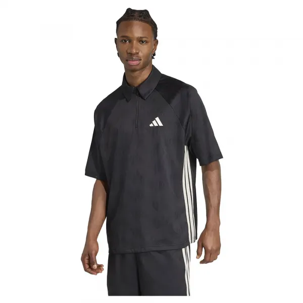 옆면에 고급 새틴 3선 스트라이프가 있는 넉넉한 핏의 자카드 니트 폴로 셔츠입니다.