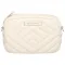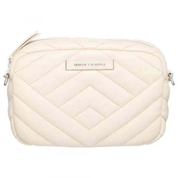 가방에는 대비되는 인서트가 있는 두 개의 체인 손잡이가 있으며 앞면에 메탈 로고가 있습니다.