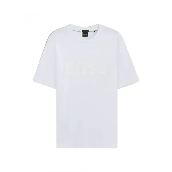 고급 면 인터록 소재로 제작되었으며 고급스러운 마감 처리가 돋보이는 프린트 티셔츠, 가슴 부분에 크고 은은한 보스 구조 로고가 특징입니다.
