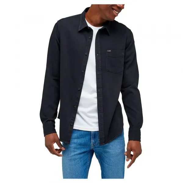 매칭되는 블랙 버튼은 깔끔한 룩을 유지하며, 블랙 및 골드 Lee 로고가 왼쪽 가슴 포켓에 부착되어 있습니다.