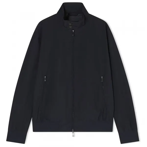 버튼 두 개와 양방향 지퍼가 달린 스탠드업 칼라.