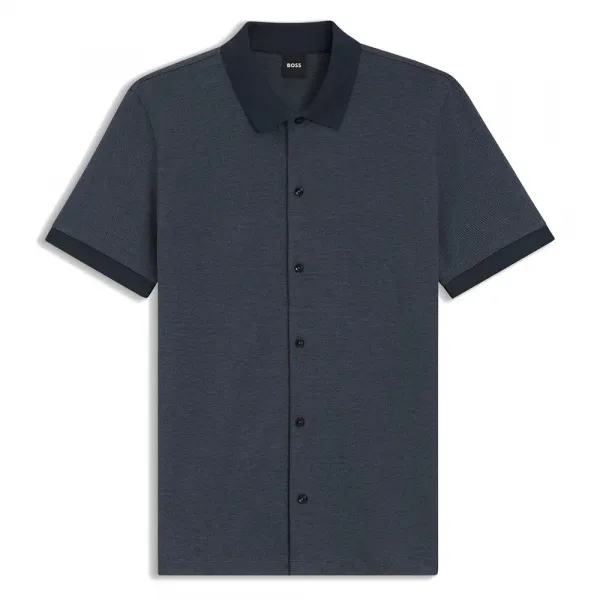 특징: - 커프스: 플랫 니트 커프스 - 길이: 스탠다드 길이 - 단추 개수: 4개 이상 - 핏: 레귤러 핏 - 네크라인: 폴로 칼라 - 소매 길이: 반팔 - 슬릿: 옆 슬릿 사양: - 소재: 100% 면