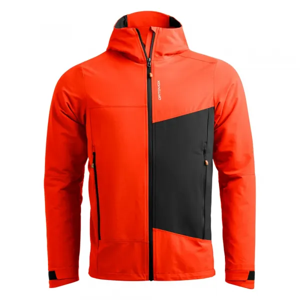 SECEDA SOFTSHELL JACKET의 특징으로는 조절 가능한 후드, 배낭에 최적화된 접근이 용이한 전면 포켓, 조절 가능한 커프스가 있습니다.