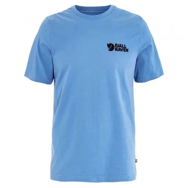 뒷면에 스웨덴 숲 풍경이 프린트된 유기농 면 반팔 티셔츠이며, 앞면에는 작은 로고가 있습니다.