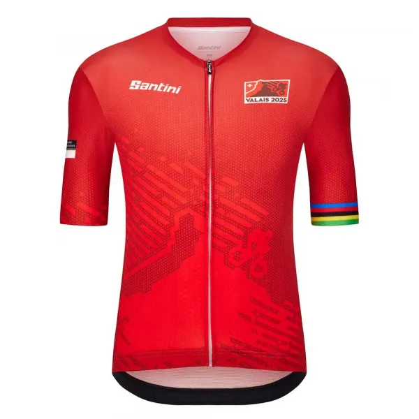 이 저지는 가슴에 두 개의 로고와 뒷면에 하나의 로고를 포함하여 발레에서 열리는 2025 UCI 산악 자전거 세계 선수권 대회를 기념하는 디자인이 특징입니다.