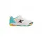 이 아동용 신발은 생동감 있고 눈길을 사로잡는 흰색과 파란색 배색이 특징입니다.