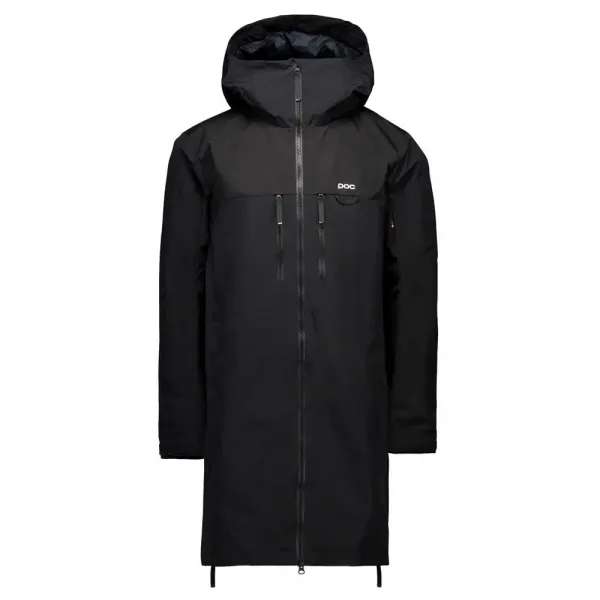 방수 코트는 조절 가능하고 헬멧과 호환되는 후드, 왼쪽 팔에 지퍼가 달린 스키 패스 포켓, 코트 측면에 지퍼가 달린 솔기가 있어 스키를 쉽게 탈 수 있습니다.