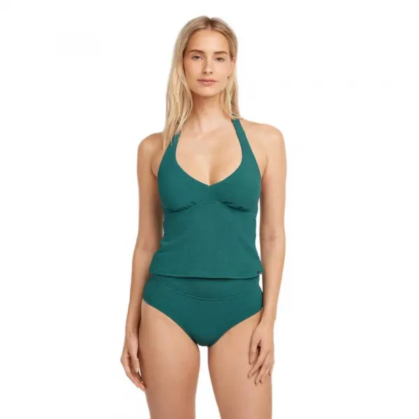 이 탑은 접어 올릴 수 있는 허리 밴드가 있는 하이웨이스트, 풀 커버리지 하의와 매끄럽게 어울립니다.