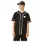 플래킷과 커프스가 있는 100% 면 저지 야구 저지, 왼쪽 가슴에 디스트레스드 팀 로고 프린트.
