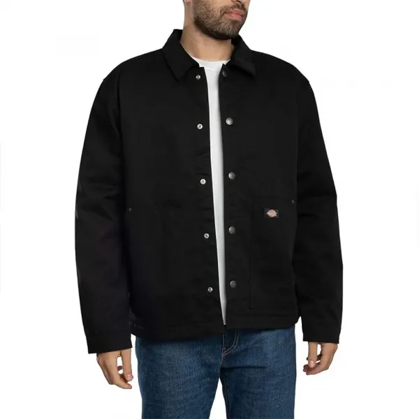 3oz 폴리코튼 혼방 소재로 제작되었으며, 이 재킷은 코듀로이 칼라, 앵글 입구와 금속 리벳이 있는 전면 패치 포켓, 중앙 스냅 잠금, 내부 양파 퀼팅, 등 부분에 자수된 커다란 딕키즈 아이콘 윤곽 로고, 패치 포켓에 새겨진 상징적인 딕키즈 직조 라벨이 특징입니다.