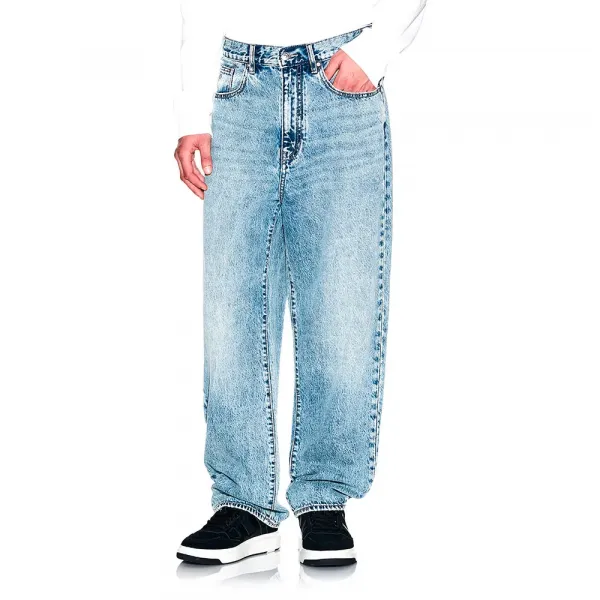 실루엣은 약 12온스의 스톤 블리치 워싱이 적용된 솔리드 코튼 데님 소재의 현대적인 루즈 핏으로 정의됩니다.