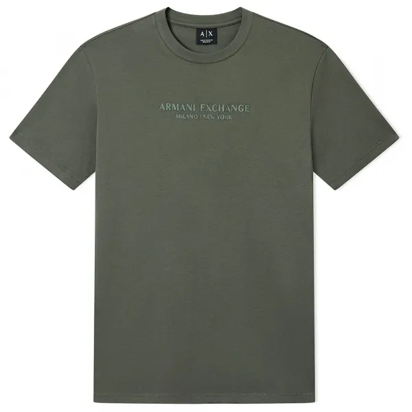 코튼 저지 티셔츠 레귤러 핏 크루넥 반팔 가슴 부분에 톤온톤 레터링의 Armani Exchange Milano / New York 로고 디테일