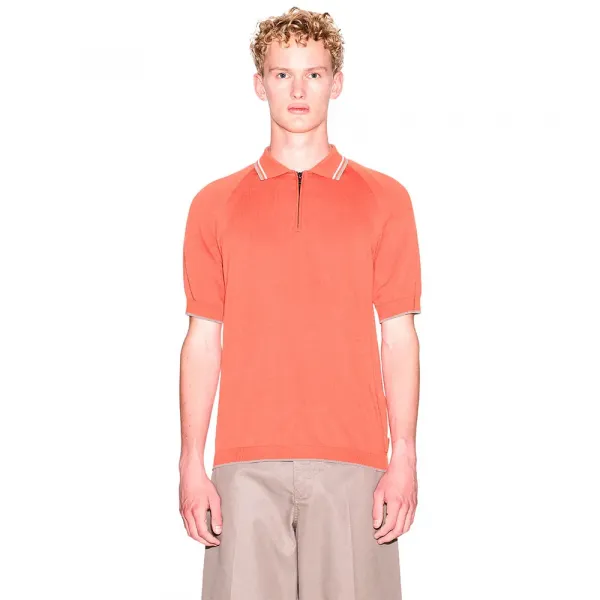소매, 넥, 밑단에 대비되는 색상으로 팁을 넣은 반팔 폴로 셔츠.