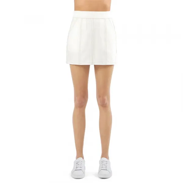하이 웨이스트의 옆트임이 있는 미니스커트로, 두 개의 사선 포켓이 있으며 뒷면에는 히든 지퍼 클로저, 오른쪽에 웰트 포켓과 로고 패치가 있습니다