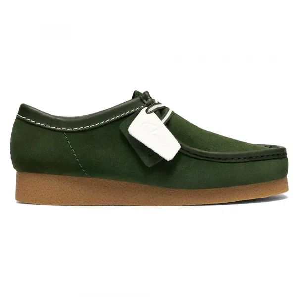 CLARKS의 월라비는 블랙 스웨이드 갑피를 특징으로 합니다.
