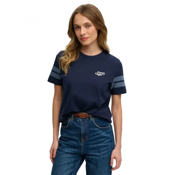 기술 사양: * 제품: 베이스볼 스트라이프 스크립트 티셔츠 * 네크라인: 라운드 넥 / 크루 넥 * 소매: 프린트 스트라이프 디테일의 반팔 * 그래픽: 체스트 스탬프 - 텍스처 프린트의 SUPERDRY 스크립트 로고 * 브랜딩: 소매의 시그니처 SUPERDRY 로고 탭 * 성별: 여성 * 주요 소재: 코튼