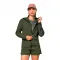 운동복 핏으로 몸에 꼭 맞는 후드, 지퍼 가슴 주머니, 반사 디테일이 특징입니다.