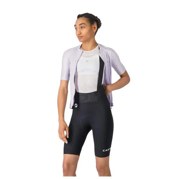 편안함과 완벽한 핏을 위한 Castelli 엔지니어링 에스프레소 도피오 원단 실리콘 그리퍼가 있는 로우컷 레그 엔딩 편안함과 쉬운 휴식을 위한 드롭 테일 스트레치 빕 스트랩 하루 종일 편안함을 위한 Progetto X2 Air Seamless Donna 시트 패드 저지와 더 부드러운 인터페이스를 위한 접힌 경량 메쉬의 확장된 전면 및 후면 패널 빕쇼트와 저지가 만나는 부분을 위한 편안함과 커버리지 향상 설계.