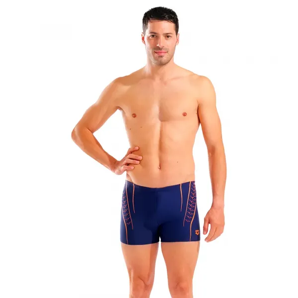 마치 두 번째 피부처럼 꼭 맞는 극도로 신축성 있는 arena Feel 남성용 더블 그래픽 수영복입니다.