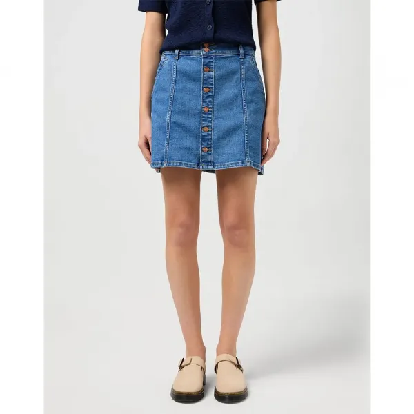 라이트 블루 데님 원단으로 제작된 이 스커트는 구리색 버튼이 달린 앞면 버튼 다운 클로저, 벨트 루프, 대비 스티칭, 은은하게 닳은 밑단으로 캐주얼하면서도 세련된 룩을 연출합니다.
