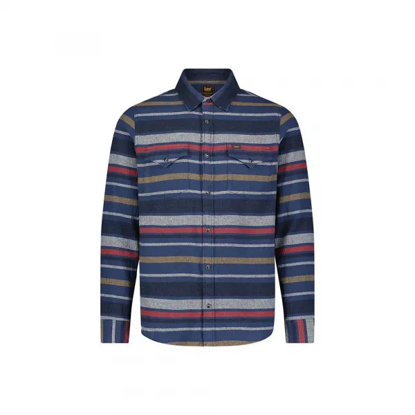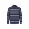 짙은 파란색 바탕은 스트라이프의 따뜻함과 대비되어 독특한 룩을 연출합니다.