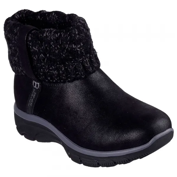 Heel Pillow® 디자인으로 제작된 이 비건 슬립온 부티는 3M® Scotchgard® 처리된 마이크로 가죽 갑피에 스웨터 니트 폴드 오버 칼라와 쿠션 처리된 Skechers Air-Cooled Memory Foam® 깔창이 특징입니다.