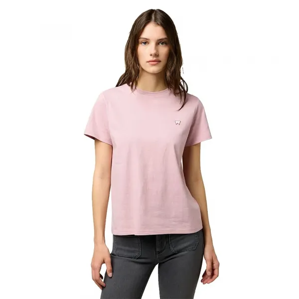 반팔, 스트레이트 헴, 왼쪽 가슴 부분의 작은 로고 패치 디테일이 특징입니다.