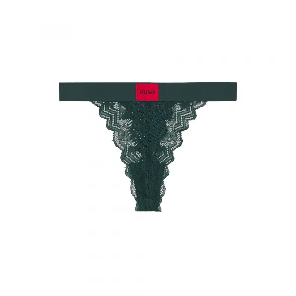 여성스러운 레이스 디자인에 레드 로고 라벨이 있는 일반적인 밑위 높이의 허리 밴드로 대비를 주었습니다.